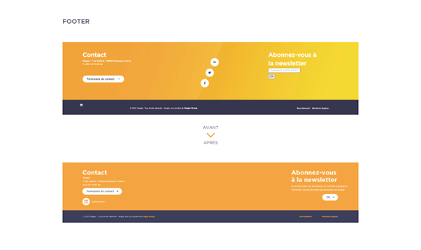 Le footer aussi a été considérablement allégé, en conservant les parties Contact et Newsletter, en ne gardant qu’un réseau social (Linkedin) et surtout le fond de couleur dégradé orange-jaune a été remplacé par le orange de base Snapp’.