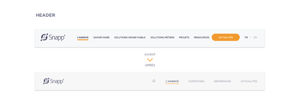 Le header est passé de 7 rubriques principales à 4, avec le menu Ressources qui est venu enrichir le menu Actualités, mais surtout en regroupant les anciens menu Solutions Grand Public, Solutions Métier et Projets en un menu unique Références.